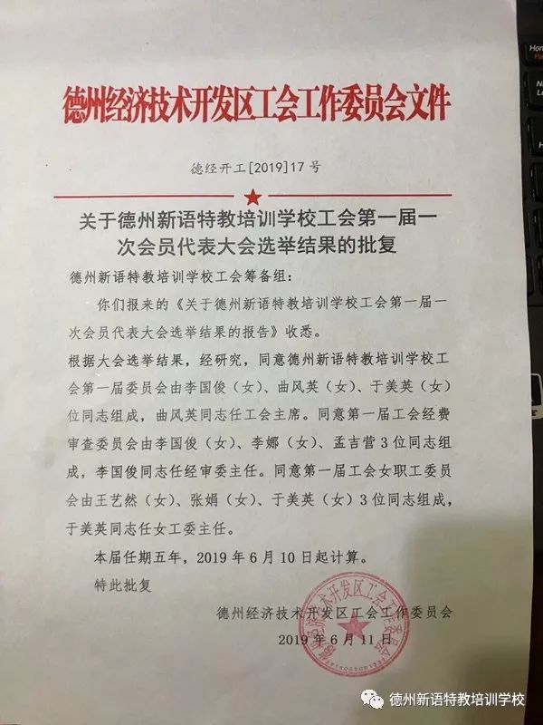 德州經(jīng)濟開發(fā)區(qū)工會工作委員會關(guān)于我校成立工會的批復(fù)文件。