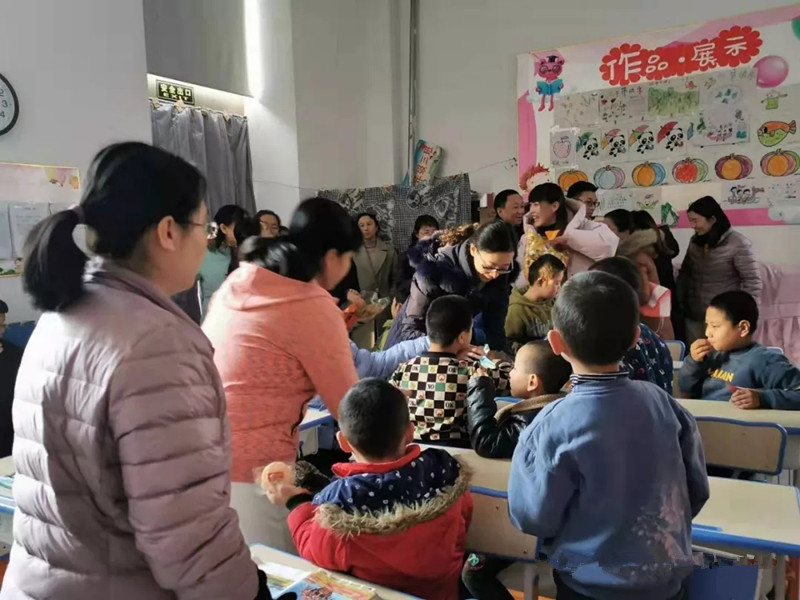 在新語李校長的陪同下,市婦幼第四黨支部的黨員叔叔阿姨走進每間教室,為孩子們送去美味的零食。