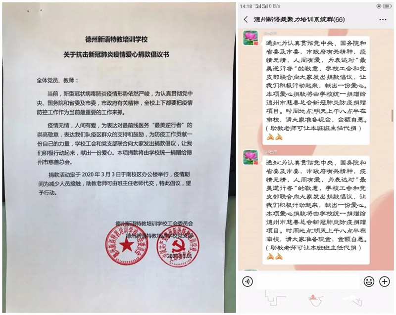 一方有難,八方支援。在全國(guó)上下共同抗擊新冠肺炎疫情的關(guān)鍵時(shí)刻,德州新語(yǔ)特教學(xué)校情系武漢,學(xué)校黨支部聯(lián)合學(xué)校工會(huì)發(fā)起倡議:獻(xiàn)出一份愛心,支援武漢,向“最美逆行者”致敬!