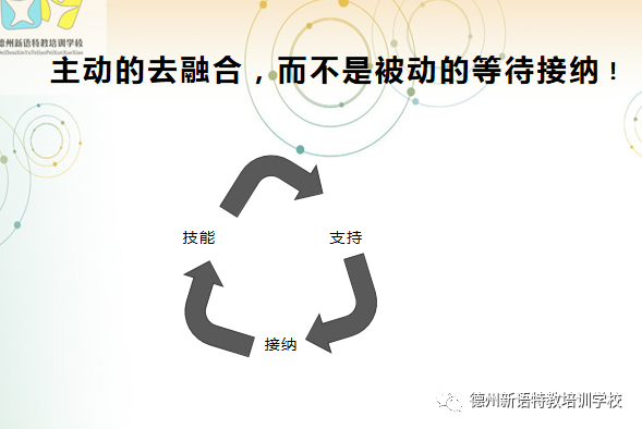 進(jìn)而,講述了孩子、家長(zhǎng)、老師三方都需要融合前的準(zhǔn)備;尤其是孩子的教育方面,分別從安全教育、常規(guī)技能、自理技能三方面展開(kāi),詳細(xì)分析:如果孩子想要融合具體需要具備怎樣的能力。