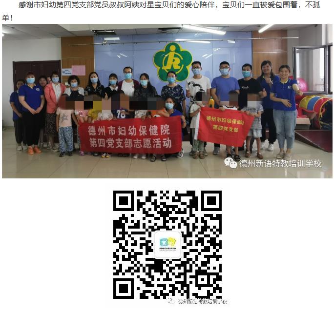 7月1日是黨的生日,在這個有意義的日子里,德州市婦幼保健院第四黨支部史揚書記攜部分黨員來到德州新語特教培訓學校南校區(qū),與星寶貝們手拉手,做游戲,送來美味的零食和衣物,陪伴孩子們度過了充實又開心的一下午。李國俊校長和兩位校區(qū)負責人:于娟老師、王藝然老師全程陪同。