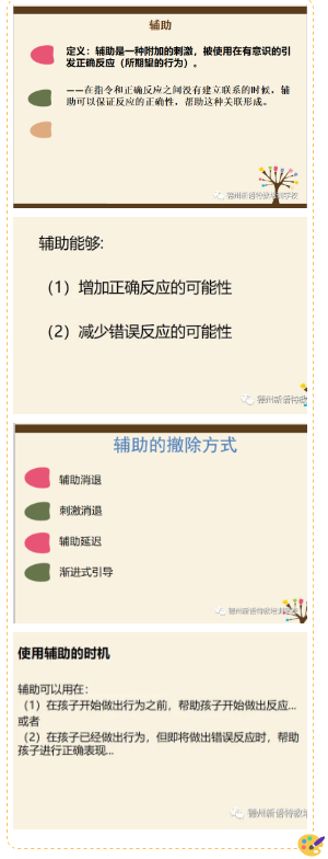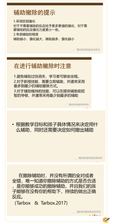 最后強調(diào)說明:輔助的撤除沒有所謂的全對或全錯,只要最后孩子沒有我們的輔助時,仍能持續(xù)做出正確反應(yīng),那我們做的就是對的。讓家長放心大膽的去嘗試,以促進(jìn)孩子提升能力。