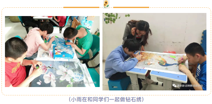 在班主任陳煥香老師的耐心指導(dǎo)和助教老師們的悉心照料下,慢慢的,我們發(fā)現(xiàn)小雨特別喜歡做鉆石繡,每次上手工課,小雨都特別開心,于是陳老師開始重點(diǎn)培養(yǎng)小雨做鉆石繡的本領(lǐng),從最簡(jiǎn)單的雙色鉆石繡,到如今幾十種顏色非常復(fù)雜的鉆石繡,小雨都能特別出色地完成。