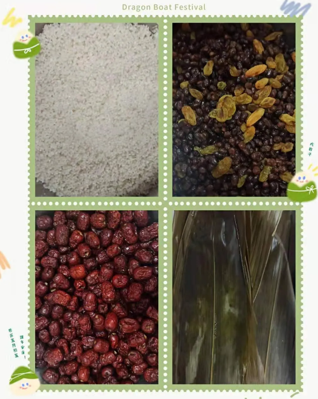 糯米、粽葉、紅棗、蜜豆都準(zhǔn)備好啦,大家洗手消毒,開始包粽子嘍!