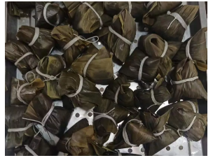 人多力量大,晶瑩的糯米、碧綠的粽葉,在志愿者們手里翻轉(zhuǎn)飛舞,不到一會(huì)兒就變成了一個(gè)個(gè)菱角分明的大粽子。