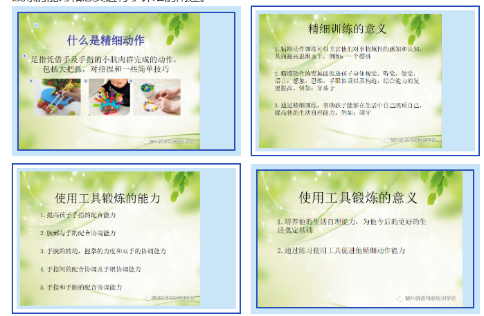 肖老師用生活中常見的例子開始講解什么是精細(xì)動作,對精細(xì)訓(xùn)練的意義,使用工具鍛煉的能力和意義進(jìn)行了詳細(xì)的闡述。