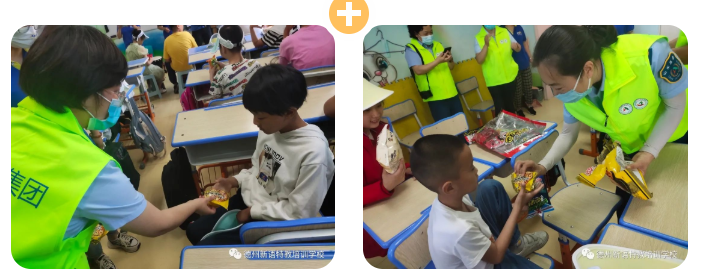 愛心人士為孩子們送上遮陽帽、牛奶、零食等,與孩子們互動交流。