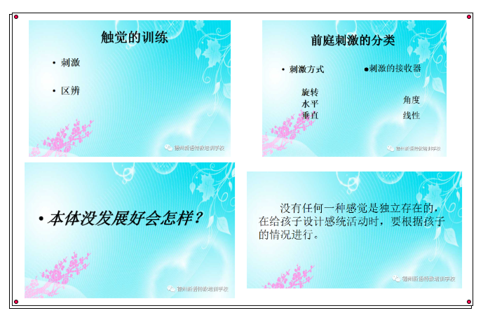 接著詳細講述了三種重要的近端感覺,通過分析孩子的行為和狀態(tài),列舉應(yīng)該給孩子練習(xí)的內(nèi)容,最后強調(diào):一定要根據(jù)孩子的情況設(shè)計活動,有目的地練習(xí),才能起到積極的作用。