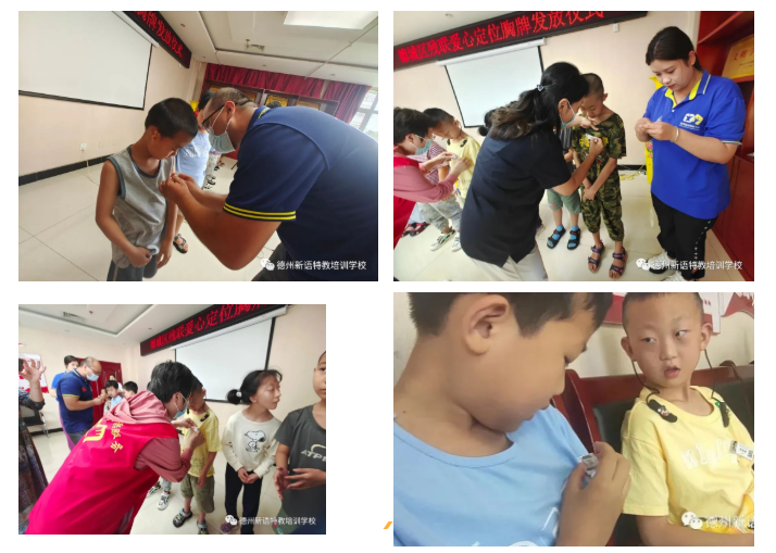 愛心定位胸牌捐贈儀式開始!德城區(qū)殘聯(lián)黃玲副理事長,三圓廣告都總,星之語李國俊校長一起為孩子們佩戴上定位胸牌,孩子們的安全又多了一重保障!