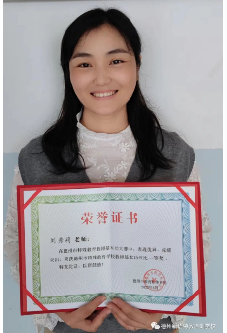 劉秀莉老師榮獲德州市特殊教育學(xué)校教師基本功評(píng)比一等獎(jiǎng)。劉秀莉老師自2005年入職德州新語(yǔ),她用扎實(shí)的理論知識(shí),豐富的教學(xué)經(jīng)驗(yàn),幫助了一批又一批特殊兒童,助力孩子們成長(zhǎng)進(jìn)步。