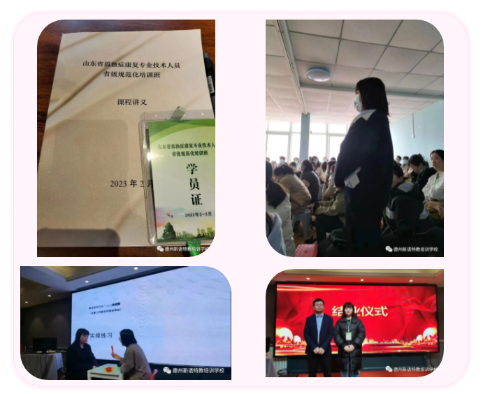 為加強(qiáng)全省孤獨癥兒童康復(fù)專業(yè)技術(shù)人員業(yè)務(wù)技能培訓(xùn),提升兒童康復(fù)服務(wù)規(guī)范化水平,2023年2月27日--3月18日,由山東省殘疾人聯(lián)合會舉辦的“全省孤獨癥兒童康復(fù)專業(yè)技術(shù)人員線下康復(fù)技術(shù)培訓(xùn)班”在濟(jì)南召開,德州新語特教學(xué)校劉雪琪老師參加了此次培訓(xùn)。